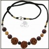 Deze hanger is gemaakt van 2 stuks 4 Mukhi Rudraksha en 1 van 6 Mukhi, geweven in een zwarte touw tot 1 geheel met rode en witte sandalhout kralen.