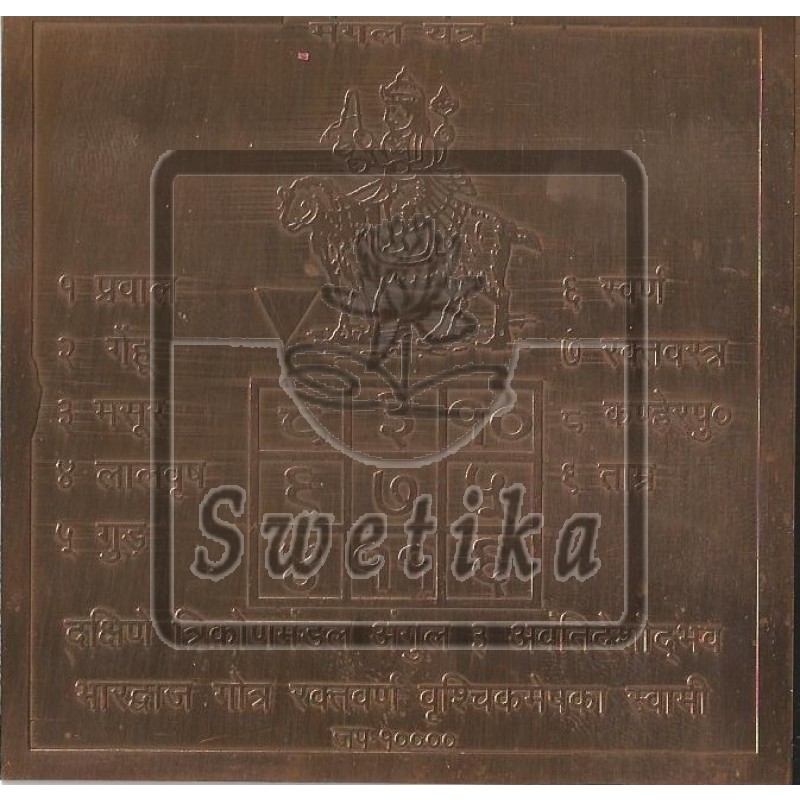 Deze koperen Mangal Yantra is voor personen die onder een negatieve invloed van planeet Mars gaan. Voor de geborene die een Kuja Dosha of Mangelik zijn kunnen eveneens op een Mangal Yantra Puja doen om een goede partner te vinden.